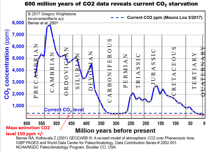 Tvärtemot vad många tror lever vi inte i en extremt varm och koldioxidrik tid utan i en av de kallaste perioderna med den lägsta koldioxidhalten på över 500 miljoner år, farligt nära gränsen för istid och koldioxidbrist för växtligheten. När de första primaterna uppträdde på jorden efter dinosaurernas utdöende var det 10°C varmare och koldioxidhalten 1 000 miljondelar, mer än dubbelt så hög som idag.